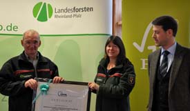 On 5 December, 2012, a first batch of twelve forest offices in Rhineland-Palatinate (RLP) has been granted a FSC (Forest Stewardship Council®) Forest Management group certificate by. GFA’s Certification Department handed the certificate over to Forestry Minister Ulrike Höfken (Green Party) at the Forest Visitor Center in Soonwald (see TVnews ). By 2014, all the 45 forest offices in the German federal state will be audited by GFA. At about 230.000 ha, this will constitute the largest FSC certification area in Germany.
