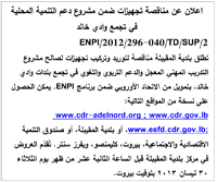 25 Février 2013 | Appel d'offres pour le contrat de fourniture de matériels éducatif pour le Cluster de Wadi Khaled |