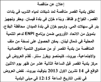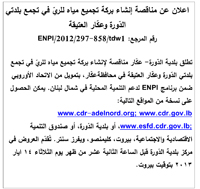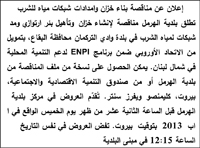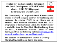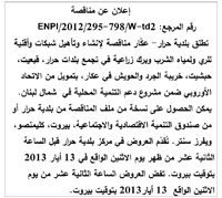 8 Avril 2013 | Appel d'offres pour le contrat de travaux pour le Cluster 'Hrar, El Houwaysh, Quabaait, Habchit, Chan et Khraybet Jered' |