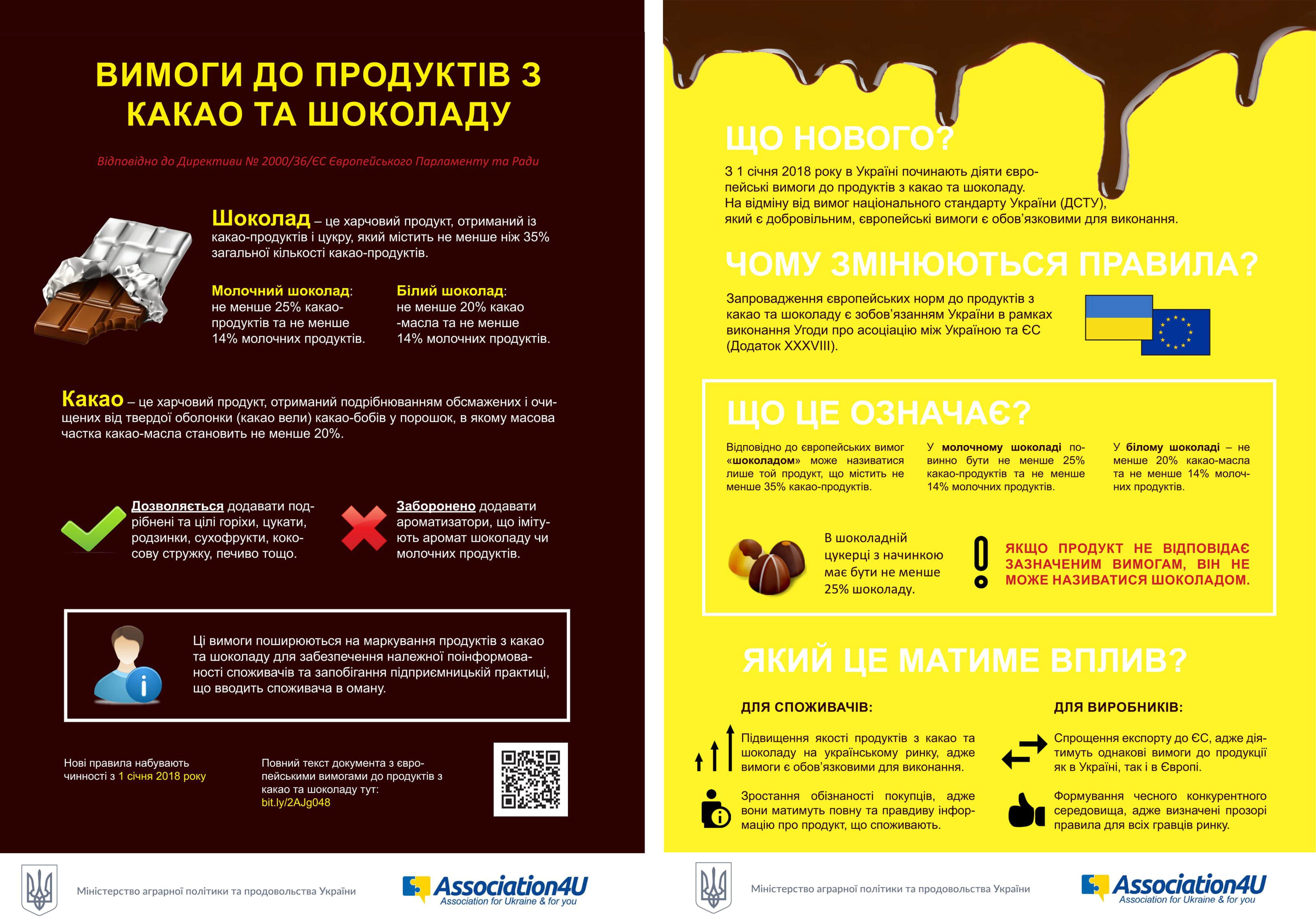 Більш детально Ольга Трофімцева зупинилася на запровадженні європейських вимог до українського шоколаду, які починають діяти з 1 січня 2018 року. Відповідно до норм ЄС у шоколаді має бути не менше 35% какао-бобів, у молочному шоколаді – не менше 25% какао-бобів та не менше 14% молочних продуктів, у білому шоколаді – не менше 20% какао-масла та не менше 14% молочних продуктів. Ці вимоги розповсюджуються на всі вироби з шоколаду – включаючи цукерки та глазур. На відміну від вимог ДСТУ (національного стандарту України), який є добровільним, європейські вимоги до продуктів з какао та шоколаду будуть обов’язковими для виконання.
