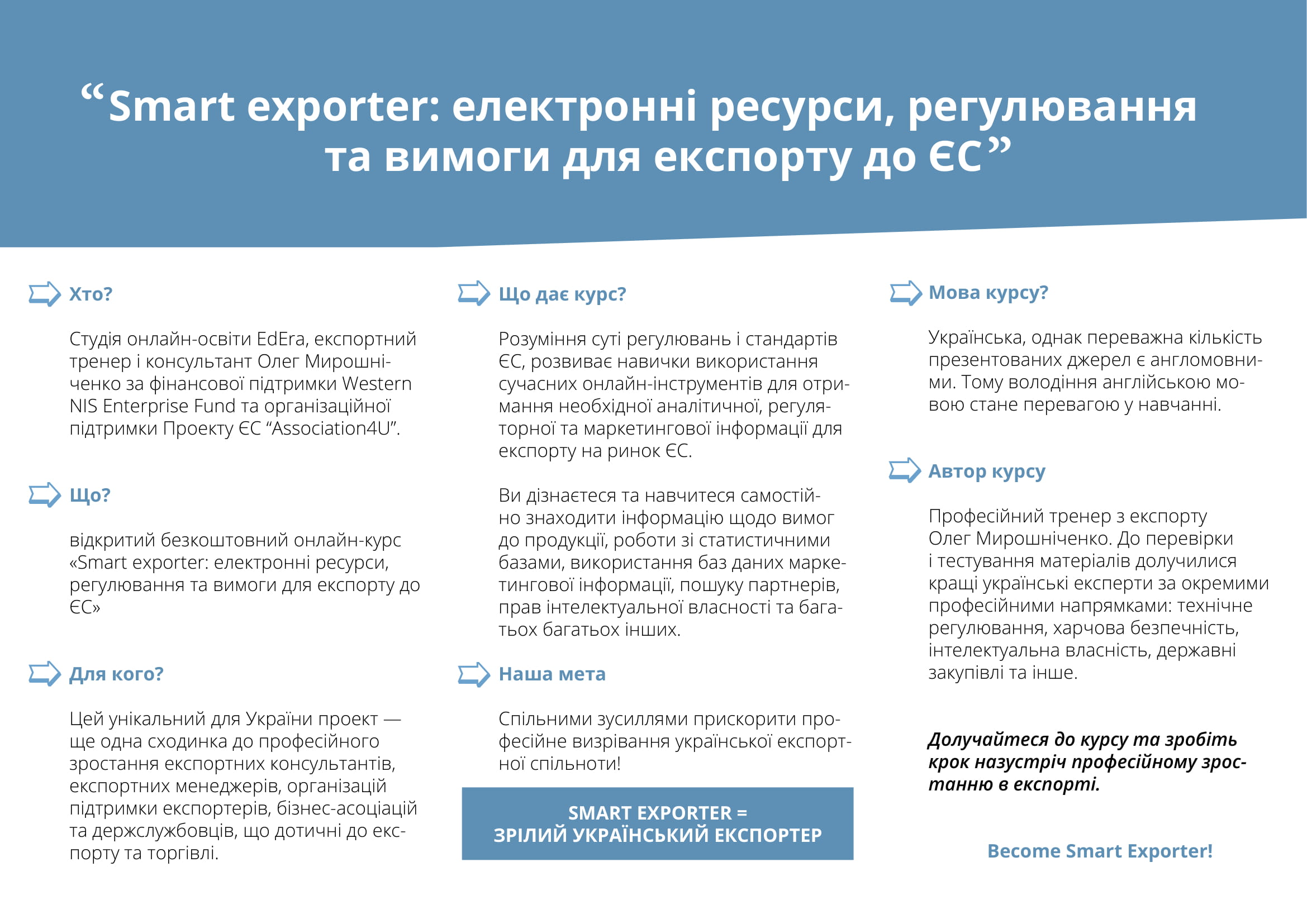 Навчальний курс дає розуміння суті регулювань і стандартів Європейського Союзу у процесі ведення експортної діяльності. Зокрема, курс розвиває навички використання сучасних онлайн-інструментів для отримання аналітичної, регуляторної та маркетингової інформації. Матеріали курсу відібрані з огляду на інформаційні потреби українських експортерів.
