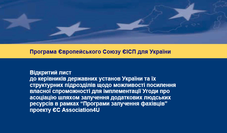 Відкритий лист до керівників державних установ України та їх структурних підрозділів щодо можливості посилення власної спроможності для імплементації Угоди про асоціацію шляхом залучення додаткових людських ресурсів в рамках “Програми залучення фахівців” проекту ЄС Association4U.