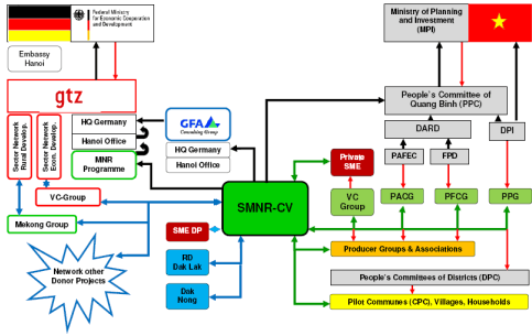 Until 2006, the role of “Project Owner” was formerly with the Vietnamese “Ministry of Planning and Investment” (MPI). In November 2006, the Government of Vietnam (GoV) issued the Decree 131/2006/ND-CP on the “Management and Utilization of ODA” which made it possible for decentralized administrative units (such as PPC of provinces and cities, provincial line departments, etc.) to assume full responsibility. However, decentralized project owners, such as the PPC of Quang Binh still report to the MPI on certain issues (such as on financial disbursements of ODA, representation in intergovernmental negotiations, etc.) and receive “guidance” on other more strategic issues. The institutional relations between the SMNR-CV and the MPI have thus weakened over the last couple of years. Personal contacts are, however, maintained.
