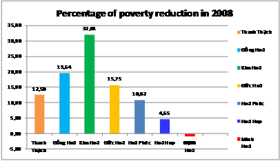 Tùy thuộc vào điều kiện cụ thể của mỗi địa phương, tác động của các chương trình phát triển cộng đồng đối với vấn đề giảm nghèo ở các xã khá khác nhau. Cụ thể như, các xã Đồng Hóa, Đức Hóa và đặc biệt là Kim Hóa được mùa lạc trong năm 2008 và người dân trồng lạc lại được lợi hơn khi giá lạc trên thị trường tăng lên khoảng gấp đôi so với năm trước. Vì thế, thực tế giảm nghèo ở các xã này trong năm qua chỉ có một phần đóng góp rất nhỏ của Dự án SMNR-CV. Tuy nhiên, tỷ lệ hộ nghèo ở xã Minh Hóa lại tăng nhẹ. Theo xã cho biết, so với các xã xung quanh thì đợt rét kéo dài vào đầu năm 2008 làm ảnh hưởng lớn nhất đến vụ lúa đông và làm chết nhiều trâu, bò trên địa bàn xã Minh Hóa. Vì thế, chương trình phát triển cộng đồng tại xã Minh Hóa đã phần nào đóng góp vào việc giảm thiểu tình trạng tăng tỷ lệ hộ nghèo ở xã này.