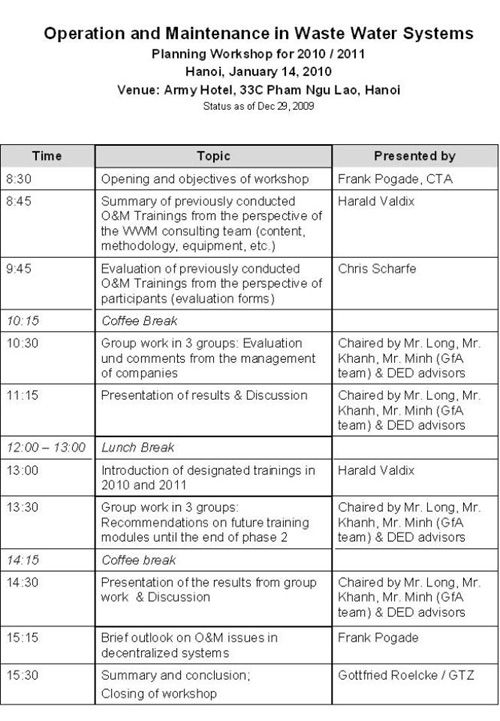 Operation and Maintenance issues are of highest importance for the operators of sewage and drainage systems. Our project has been providing a number of training courses and workshops in the 6 participating cities and would like to disseminate experiences and lessons learned to concerned organizations and institutions. Additionally, we would like to develop our approach for 2010 and 2011, in order to create a stable basis for our O&M activities until the end of project phase 2. Therefore, we are going to conduct a “ Planning Workshop on Operation and Maintenance in Waste Water Systems for 2010 to 2011 ” on January 14, 2010, at Army Hotel, 33 C Phạm Ngũ Lão, Hanoi.